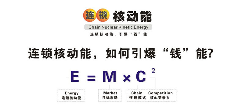 ,這是世界著名的愛因斯坦能量公式。基于愛因斯坦的相對論和能量公式,產生了原子彈和核電站,今天的人類太空實踐證實了愛因斯坦理論的正確性,人類因此發生了翻天覆地的變化。在愛因斯坦的能量公式中,M是質量,C是光速,當速度為光速時,即使很小的質量也能轉化為非常大的能量。 廣州采納企業管理顧問有限公司首席咨詢師陳宏創建的的連鎖核動能理論(全名:連鎖內核能量裂變激增理論)是以愛因斯坦的能量公式為基礎創建,但其含義和指向是不同的:M=目標市場(Market),C1=連鎖模式(Chain),C2 =核心競爭力(Competition),其理論意義是,企業找準了目標市場,以連鎖的方式經營,核心競爭力越大,推動其發展能量就越大。 連鎖核動能理論如何幫助連鎖企業“引爆錢能”快速發展?我們用深入淺出的圖形表達方式對該理論進行分層闡述: